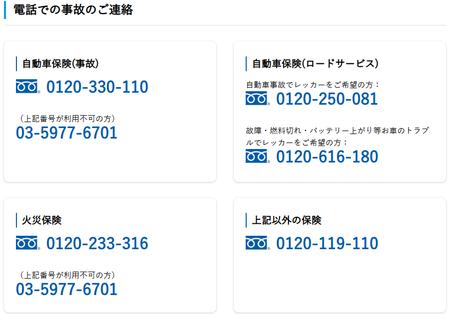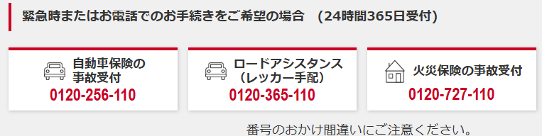 ※なお、保険会社各社のホームページでも事故受付に関する情報が掲載されておりますので合わせてご確認いただけまます。一部、商品ではインターネットでの事故受け付けも実施されております。
